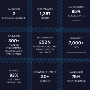 - Continued development of our bid training services, with bid writing courses tailored to the level of experience, bid writing needs and industry/sector of each client. New and exciting courses have been developed including social value, writing for success and shorter high impact courses on issues such as the new Procurement Act.
