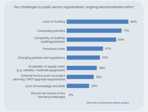 Importantly, public sector organisations are beholden to their own net zero targets and strategies – either set by their own devolved government, or aligning with central government strategies. 59% of public sector stakeholders indicate there are barriers in place to achieving targets which are a significant hindrance to meeting the 2035 goal.