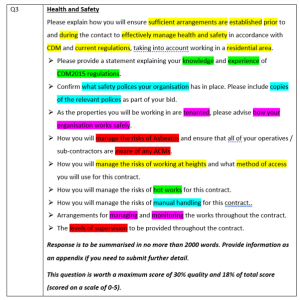 Consequently, you should break down each question into constituent parts by highlighting each theme and topic to be covered in the tender response, ensuring nothing is missed or omitted.
